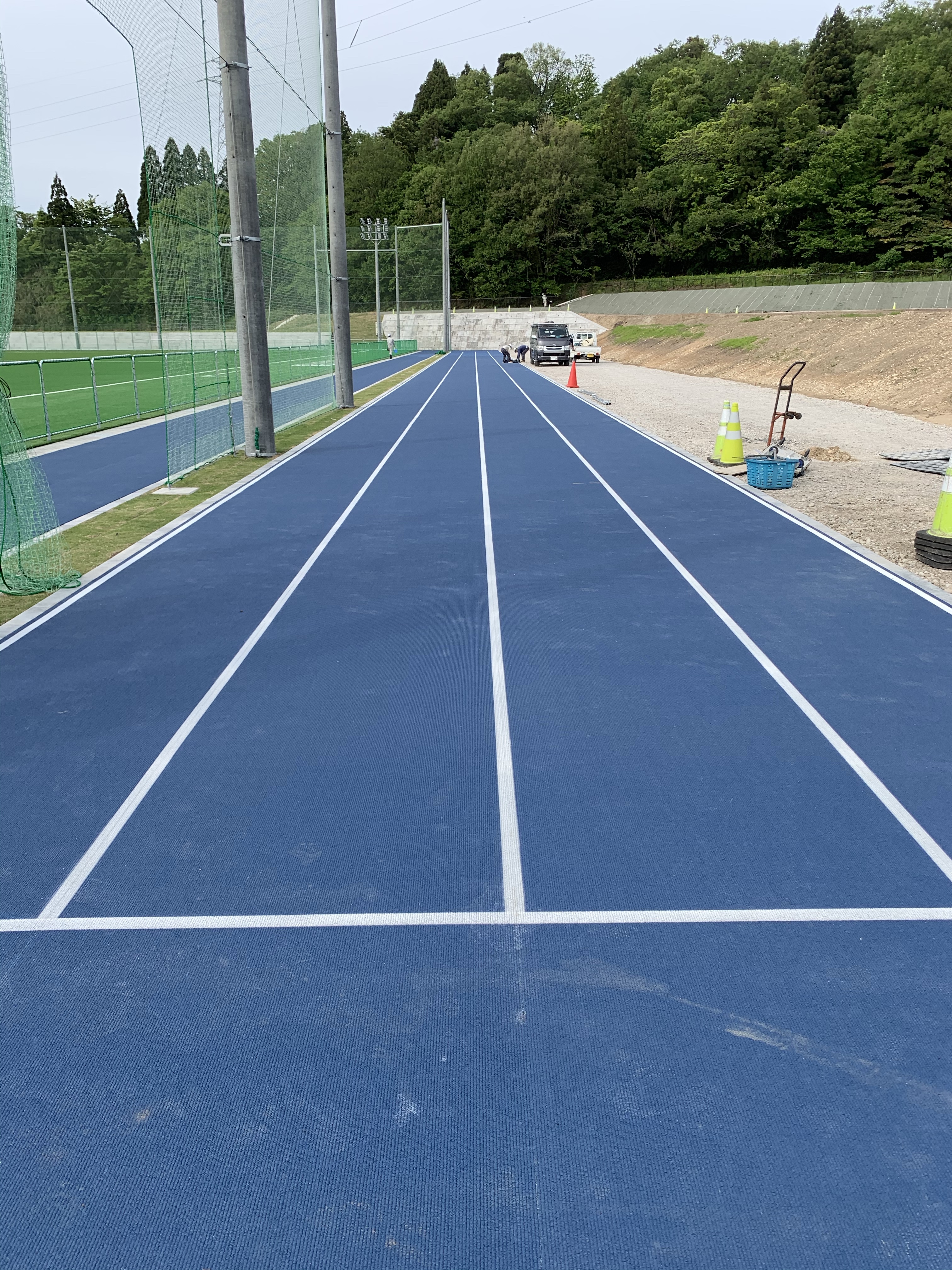 学校のグラウンドを囲む様な形のランニング走路と隣接する100m直走路を合成ゴムシートで仕上げました